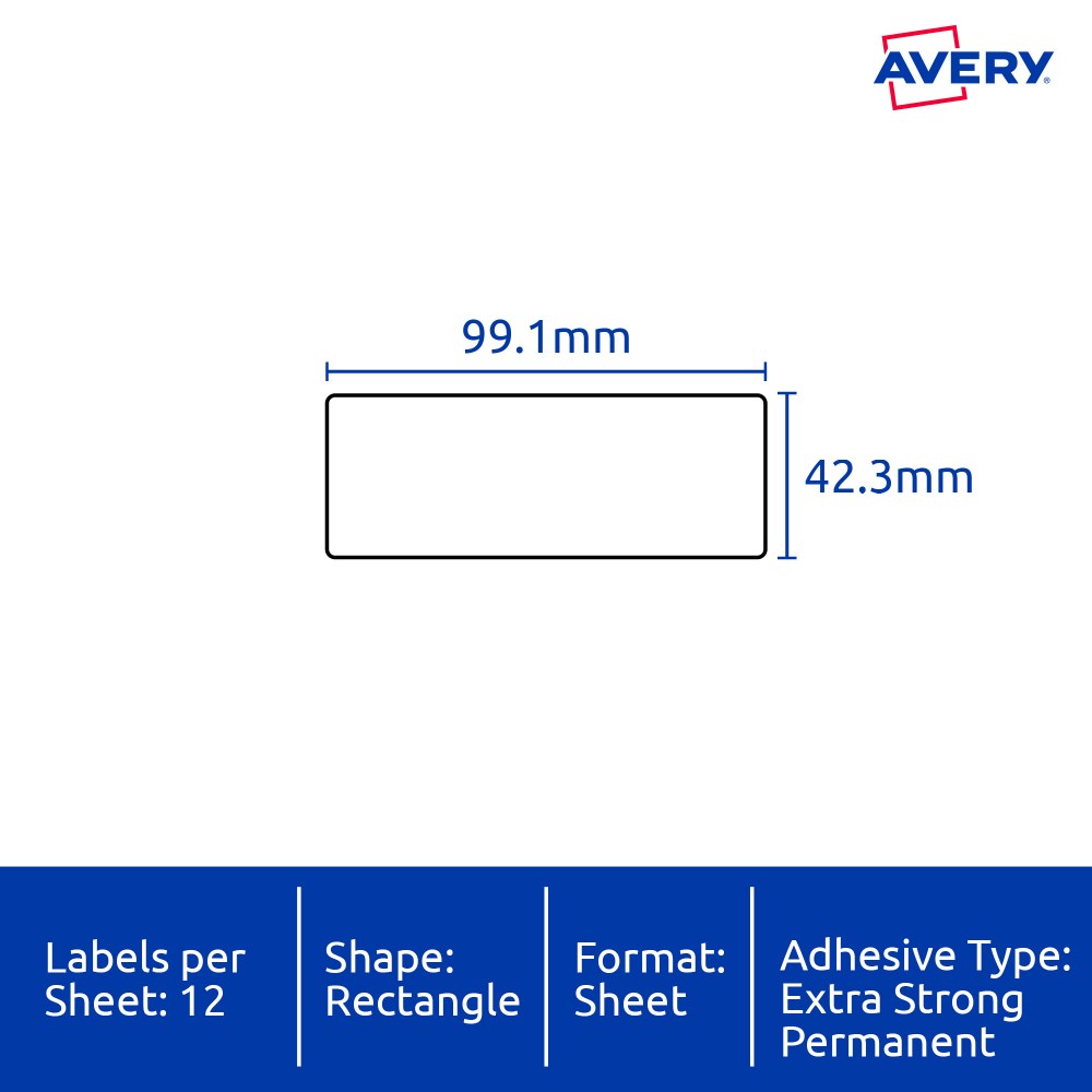 • Size: 99.1x42.3mm 120 labels, 10 sheets. 12 labels per sheet (12UP).
