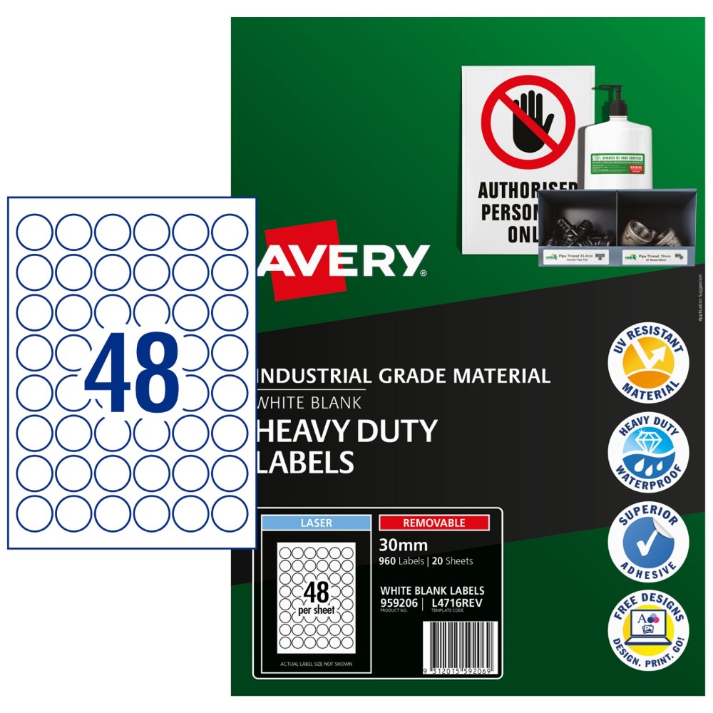 Avery Identification Removable Heavy Duty Laser White L4716 30mm Round 48UP 960 Labels