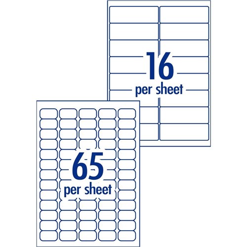 • Home office label kit. 2 sizes: 99.1 x 34mm (16UP 128 labels) and 38.1 x 21.2mm (65UP 130 labels).