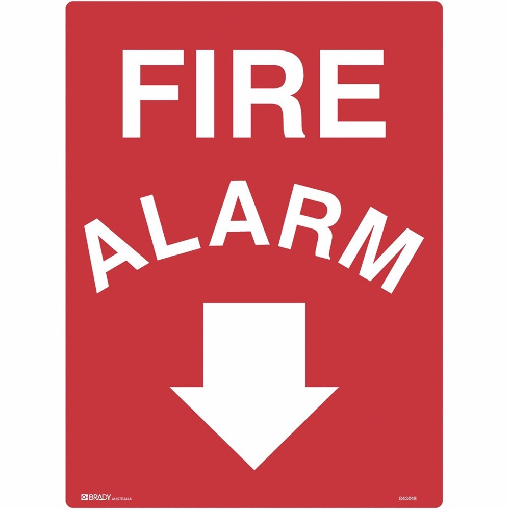 Brady Fire Sign Fire Alarm With Arrow Down 450W x 600mmH Metal White/Red