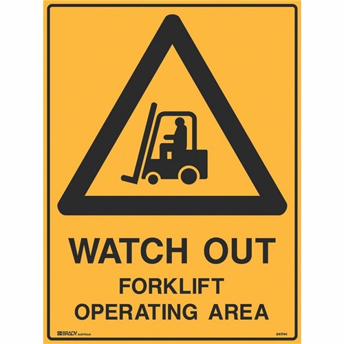 Brady Warning Safety Sign Watch Out Forklift Operating Area 450Wx600mmH Metal Yellow