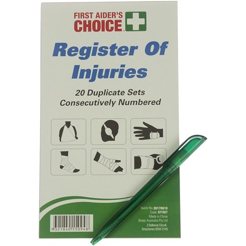 First Aider's Choice First Aid Register Of Injuries Book And Pen