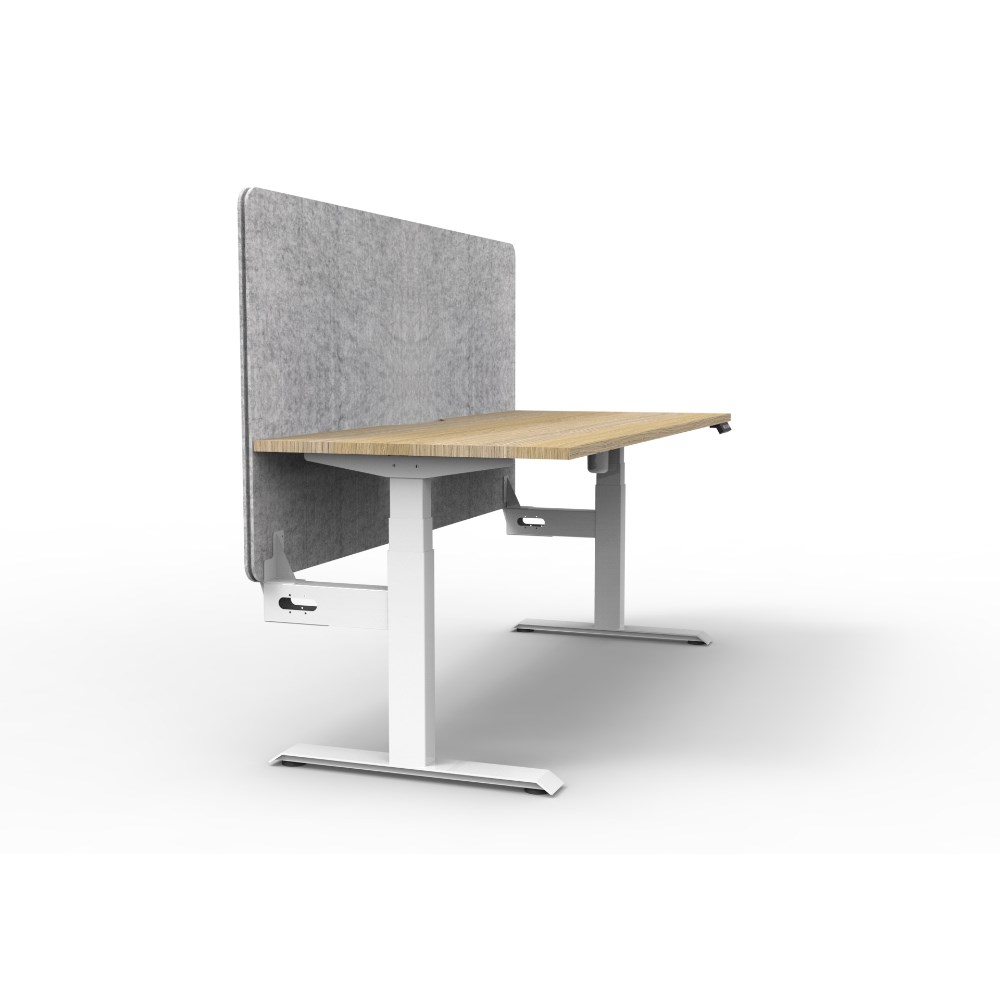 • Electric height adjustable single sided workstation with Natural Oak top and White Satin frame, Grey Eco screen.