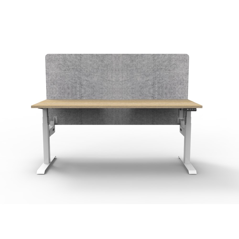 • Electric height adjustable single sided workstation with Natural Oak top and White Satin frame, Grey Eco screen.