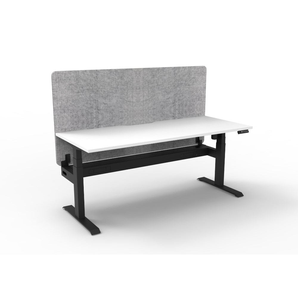 • Electric height adjustable single sided workstation with Natural White top and Black Satin frame, Grey Eco screen and cable tray.