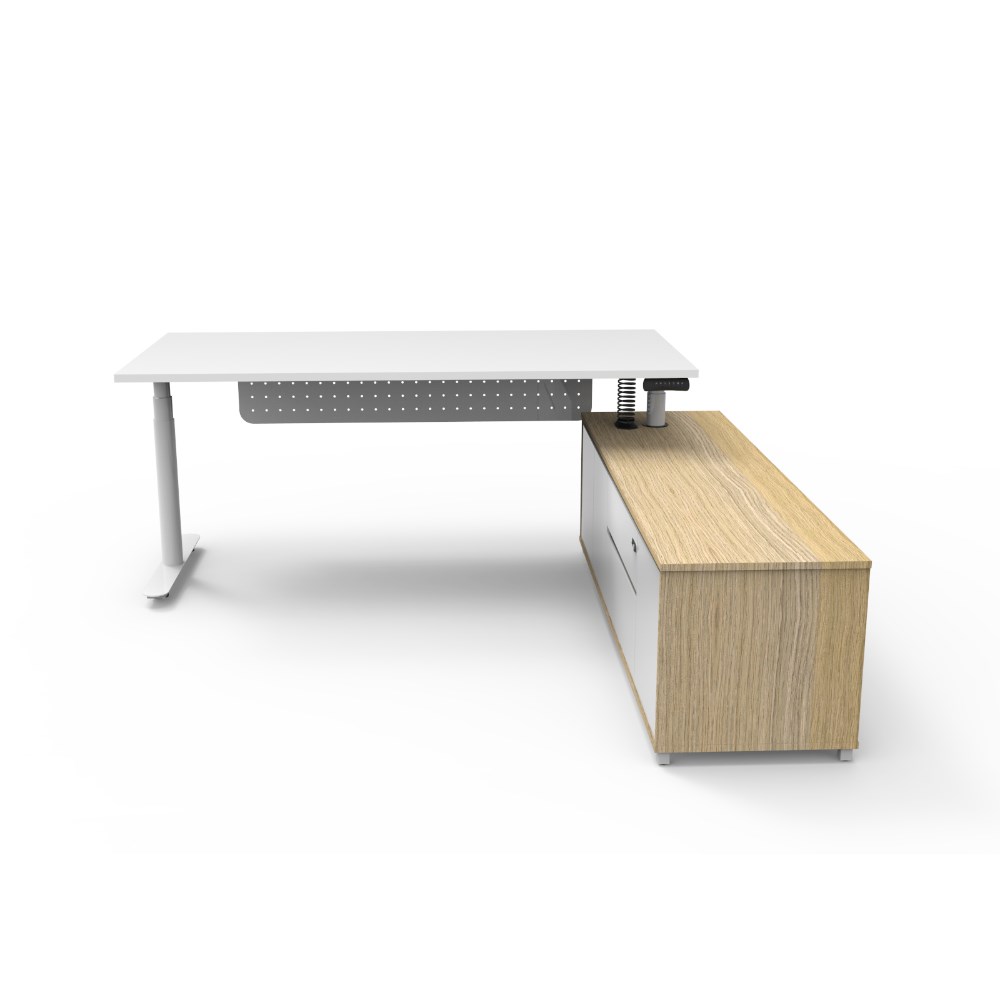 • Natural White top and White Satin frame. Height adjustable desk with modesty panel and right hand side cabinet.