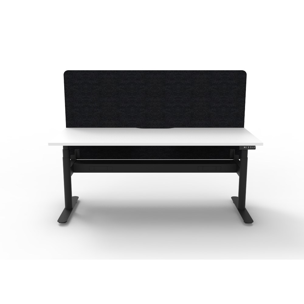 • Natural White worksurface with rigid edging and 50mm scallop cable cut out. E0 rated 25mm top. Black Satin powder coat round-leg frame. Eco screen and cable tray.