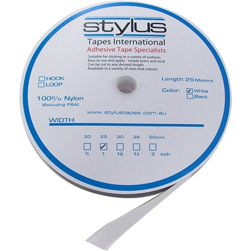 Stylus Hook Fastener 25mmx25m Strip White 25m Roll Hook Only