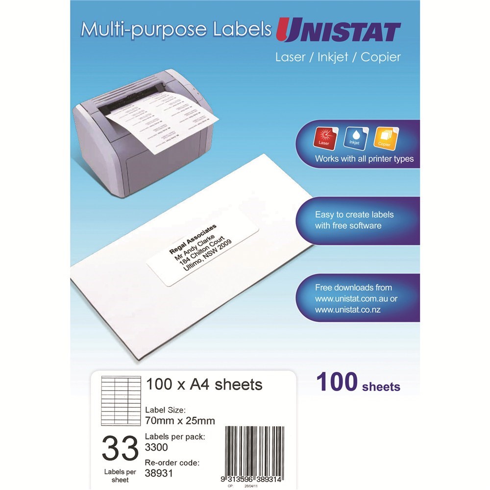 Unistat Laser Copier & Inkjet Labels 70x25mm 33UP 3300 Labels 100 Sheets